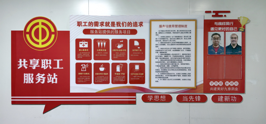 11月25日,公司第一個共享職工服務(wù)站在包裝中心成立并投入使用。共享職工服務(wù)站文化墻上醒目地提示著共享服務(wù)項目、使用管理辦法,為了豐富文化墻內(nèi)容,還增添了“與榜樣同行遇見更好的自己”優(yōu)秀員工光榮榜。共享職工服務(wù)站內(nèi)共享物品齊全,擺放整齊,共享設(shè)施設(shè)備即符合藥企規(guī)范,也充滿溫馨,充滿愛意。服務(wù)站提供的服務(wù)項目包括:1、愛心服務(wù)柜。愛心服務(wù)柜備用日常應(yīng)急藥品,以備不時之需;包裝中心員工每天高效、重復(fù)的包裝動作很容易被包材劃傷手部,愛心服務(wù)柜為包裝崗位員工配備了處理傷口的藥品和防護(hù)用品。2、公用雨傘。雨雪天氣,為特殊需要的員工提供共享雨傘。3、白鋼洗手池+熱水器+洗手液。洗手池帶有冷、熱水調(diào)節(jié)開關(guān),讓員工在寒冷的天氣里,能夠使用溫水洗手,暖手暖心。4、洗手烘干機(jī)。員工進(jìn)入操作間洗手后及時烘干,確保員工衛(wèi)生安全。5、酒精手消毒機(jī)。包裝人員在進(jìn)入包裝間前雙手要進(jìn)行酒精消毒,以保證衛(wèi)生,同時防止交叉感染和病從手入。6、多層水杯柜+保溫杯。為每一名員工配備了大容量保溫杯,統(tǒng)一存放在多層水杯柜中,根據(jù)姓名、編號,員工可以快捷地找到自己的水杯,為員工喝熱水提供方便,環(huán)境也更加美觀整潔。7、手指套+手套。服務(wù)站為常年進(jìn)行手工操作的包裝人員配備了手指套和手套特殊的勞保用品,保護(hù)員工減少手部磨損和受傷。8、立式手機(jī)充電站+多孔插排。方便員工各種品牌、型號的手機(jī)充電需要。